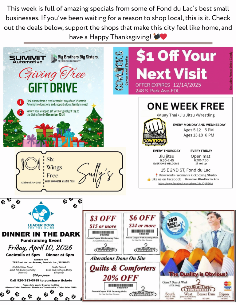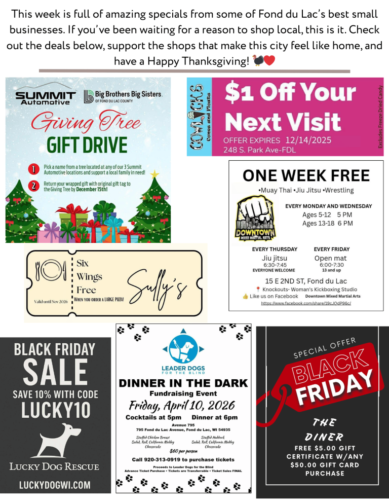 This week is packed with great specials from some of Fond du Lac’s best small businesses. If you’ve been looking for a reason to shop local, this is it. Every deal you see below is a chance to support the people who make our city feel like home. Take a look, check out the offers, and show some love to the shops that keep Fondy going. ❤️